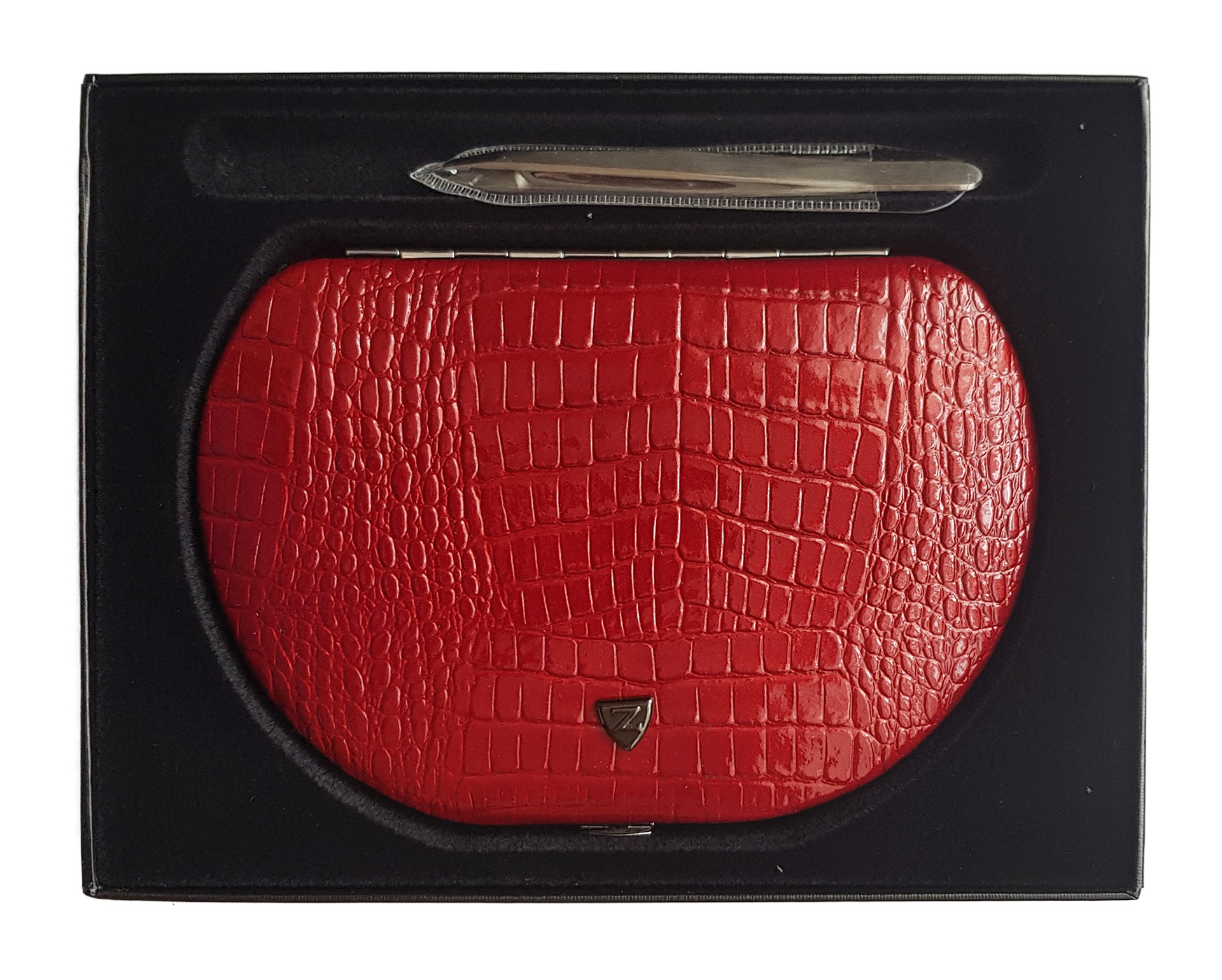 Маникюрный набор Zinger MSFC-1001-3 S. Футляр изготовлен из натуральной кожи. Внутренняя отделка футляра - мягкий велюр, имитация замши, цветом в тон коже футляра. В набор входят 9 предметов: кусачки для ногтей, маникюрные ножницы, пинцет, книпсер, триммер, металлическая пилка, 3 маникюрные палочки. Отдельно - подарок - пинцет в контейнере. Цвет покрытия металла - серебристый.