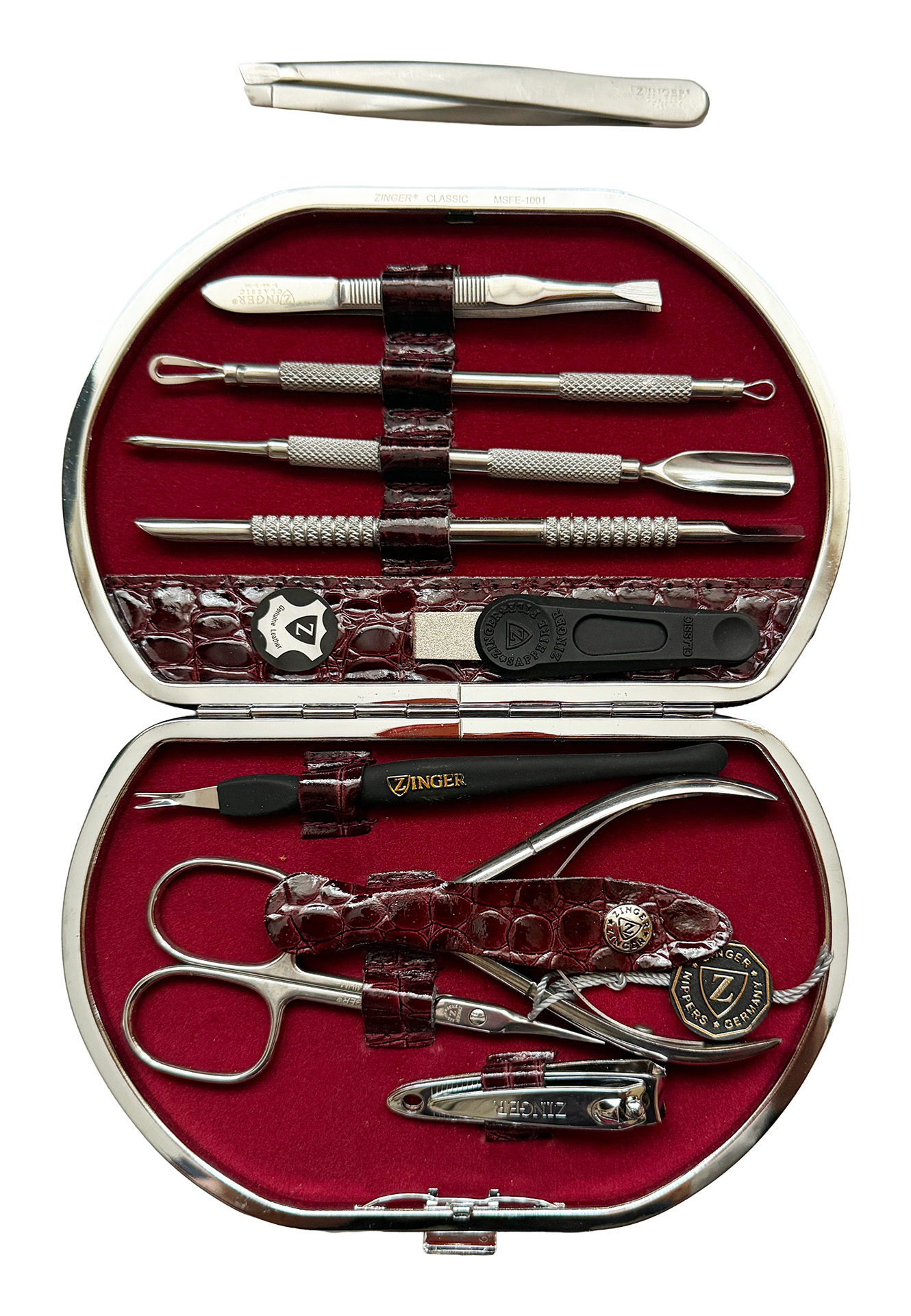 Маникюрный набор Premium-качества Zinger MSFC-1001-3 S, 9 предметов + пинцетМаникюрный набор Zinger MSFC-1001-3 S. Футляр изготовлен из натуральной кожи. Внутренняя отделка футляра - мягкий велюр, имитация замши, цветом в тон коже футляра. В набор входят 9 предметов: кусачки для ногтей, маникюрные ножницы, пинцет, книпсер, триммер, металлическая пилка, 3 маникюрные палочки. Отдельно - подарок - пинцет в контейнере. Цвет покрытия металла - серебристый.Производитель: Zinger Цвет * Недоступно Недоступно Недоступно Недоступно Недоступно 5 440,00 ₽ Количество: В корзину Пользовательский список пожеланий OKДобавить в список пожеланийСравнитьСообщить другуИнструменты изготовлены из высококачественной стали марки AISI 420 (40Х13). Технология закалки позволяет сочетать необходимую упругость и высокую твёрдость металла. Вся серия заточена вручную, по стандартам мастеров маникюра: с дополнительной обработкой лезвий и полировкой кончиков. ХарактеристикиИмя атрибутаЗначение атрибутаКоличество в упаковке9 + 1 шт.ПроизводствоЮжная Корея