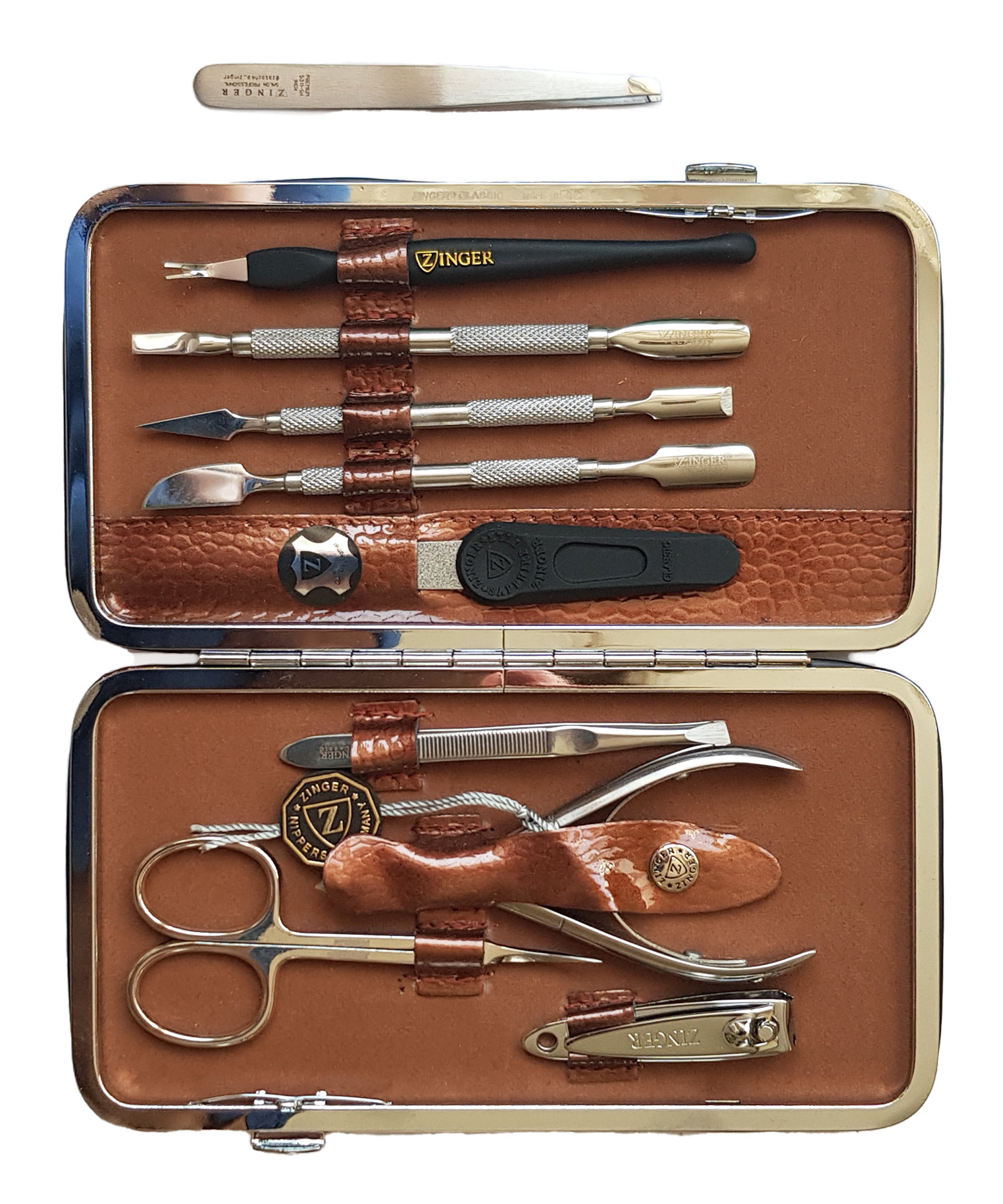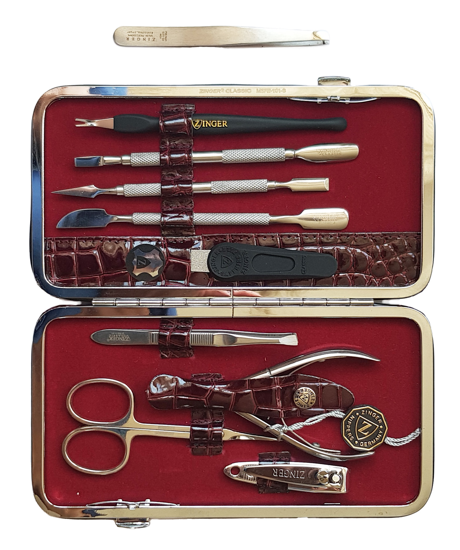 Маникюрный набор Premium-качества Zinger MSFC-101-3 S, 9 предметов + пинцетМаникюрный набор c инструментами Premium-качества ZINGER MSFС-101-3 S. Футляр изготовлен из натуральной кожи. Внутренняя отделка футляра - мягкий велюр, имитация замши. Подарочная коробка с логотипом, внутри отделана бархатной бумагой. В набор входят 9 предметов: кусачки для кутикулы, ножницы для кутикулы, пинцет скошенный, книпсер, пилка алмазная, 3 металлических пушера, триммер. Отдельно - подарок - пинцет в контейнере.Производитель: Zinger Цвет * Недоступно Недоступно Недоступно Недоступно Недоступно Недоступно Недоступно Недоступно Недоступно 5 280,00 ₽ Количество: В корзину Пользовательский список пожеланий OKДобавить в список пожеланийСравнитьСообщить другуИнструменты изготовлены из высококачественной стали марки AISI 420 (40Х13). Технология закалки позволяет сочетать необходимую упругость и высокую твёрдость металла. Вся серия заточена вручную, по стандартам мастеров маникюра: с дополнительной обработкой лезвий и полировкой кончиков. Инструменты произведены в Италии.Набор подходит как для домашнего, так и для профессионального использованияЦвет напыления-серебристый.ХарактеристикиИмя атрибутаЗначение атрибутаКоличество в упаковке9 + 1 шт.ПроизводствоРоссия