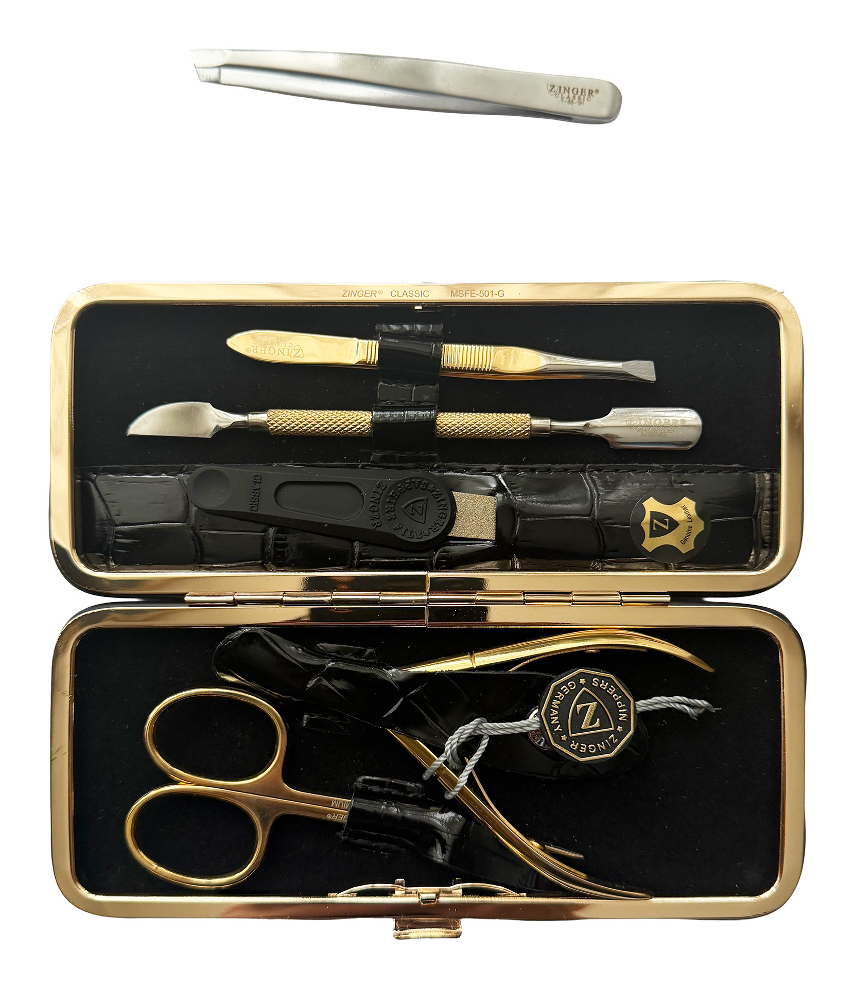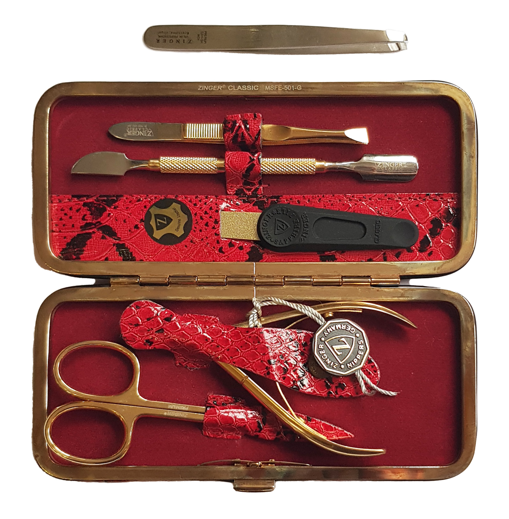 Маникюрный набор Premium-качества Zinger MSFE-501-3 G, 5 предметов + пинцет, золотистые инструментыМаникюрный набор c инструментами Premium-качества ZINGER MSFE-501-3 S. Футляр изготовлен из натуральной кожи. Внутренняя отделка футляра - мягкий велюр, имитация замши. Подарочная коробка с логотипом, внутри отделана бархатной бумагой. В набор входят 5 предметов: кусачки, ножницы, пинцет скошенный, пилка металлическая, маникюрная палочка. Отдельно - подарок – скошенный пинцет в контейнере.Производитель: Zinger Цвет * Недоступно Недоступно 4 790,00 ₽ Количество: В корзину Пользовательский список пожеланий OKДобавить в список пожеланийСравнитьСообщить другуИнструменты изготовлены из высококачественной стали марки AISI 420 (40Х13). Технология закалки позволяет сочетать необходимую упругость и высокую твёрдость металла. Вся серия заточена вручную, по стандартам мастеров маникюра: с дополнительной обработкой лезвий и полировкой кончиков. Цвет напыления-серебристый.ХарактеристикиИмя атрибутаЗначение атрибутаКоличество в упаковке5 + 1 шт.ПроизводствоРоссия