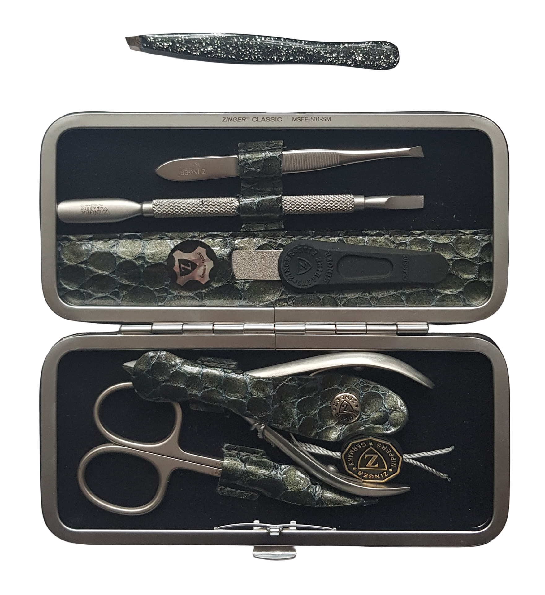 Маникюрный набор Premium-качества Zinger MSFE-501-3 SM, 5 предметов + пинцетМаникюрный набор c инструментами Premium-качества ZINGER MSFE-501-3 SM. Футляр изготовлен из натуральной кожи. Внутренняя отделка футляра - мягкий велюр, имитация замши. Подарочная коробка с логотипом, внутри отделана бархатной бумагой. В набор входят 5 предметов: кусачки, ножницы, пинцет скошенный, пилка металлическая, маникюрная палочка. Отдельно - подарок – скошенный пинцет в контейнере.Производитель: Zinger Цвет * Недоступно Недоступно Недоступно Недоступно Недоступно Недоступно 4 900,00 ₽ Количество: В корзину wishlist.addcustomwishlist OKДобавить в список пожеланийСравнитьСообщить другуИнструменты изготовлены из высококачественной стали марки AISI 420 (40Х13). Технология закалки позволяет сочетать необходимую упругость и высокую твёрдость металла. Вся серия заточена вручную, по стандартам мастеров маникюра: с дополнительной обработкой лезвий и полировкой кончиков. Цвет напыления-серебристый.ХарактеристикиИмя атрибутаЗначение атрибутаКоличество в упаковке5 + 1 шт.ПроизводствоЮжная Корея