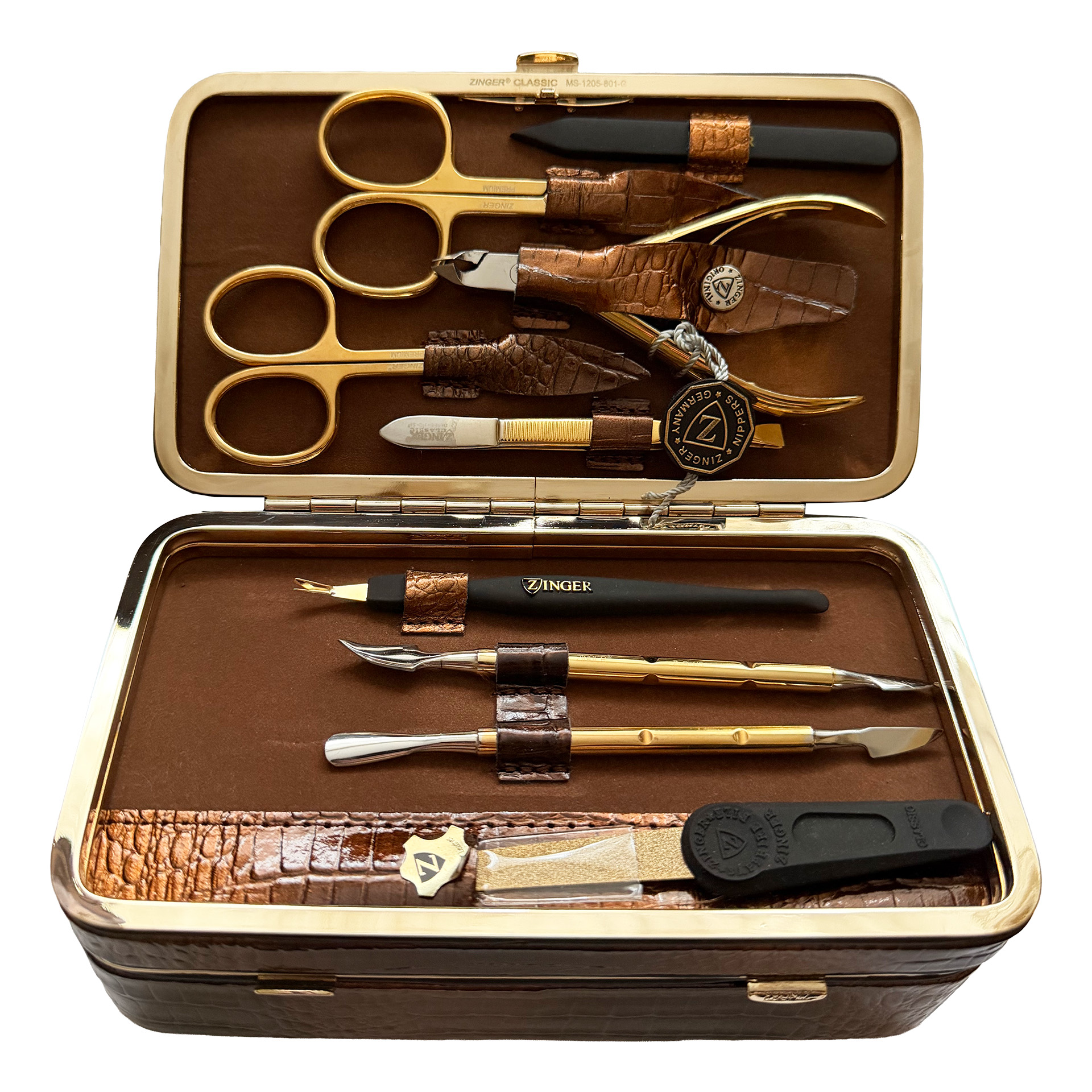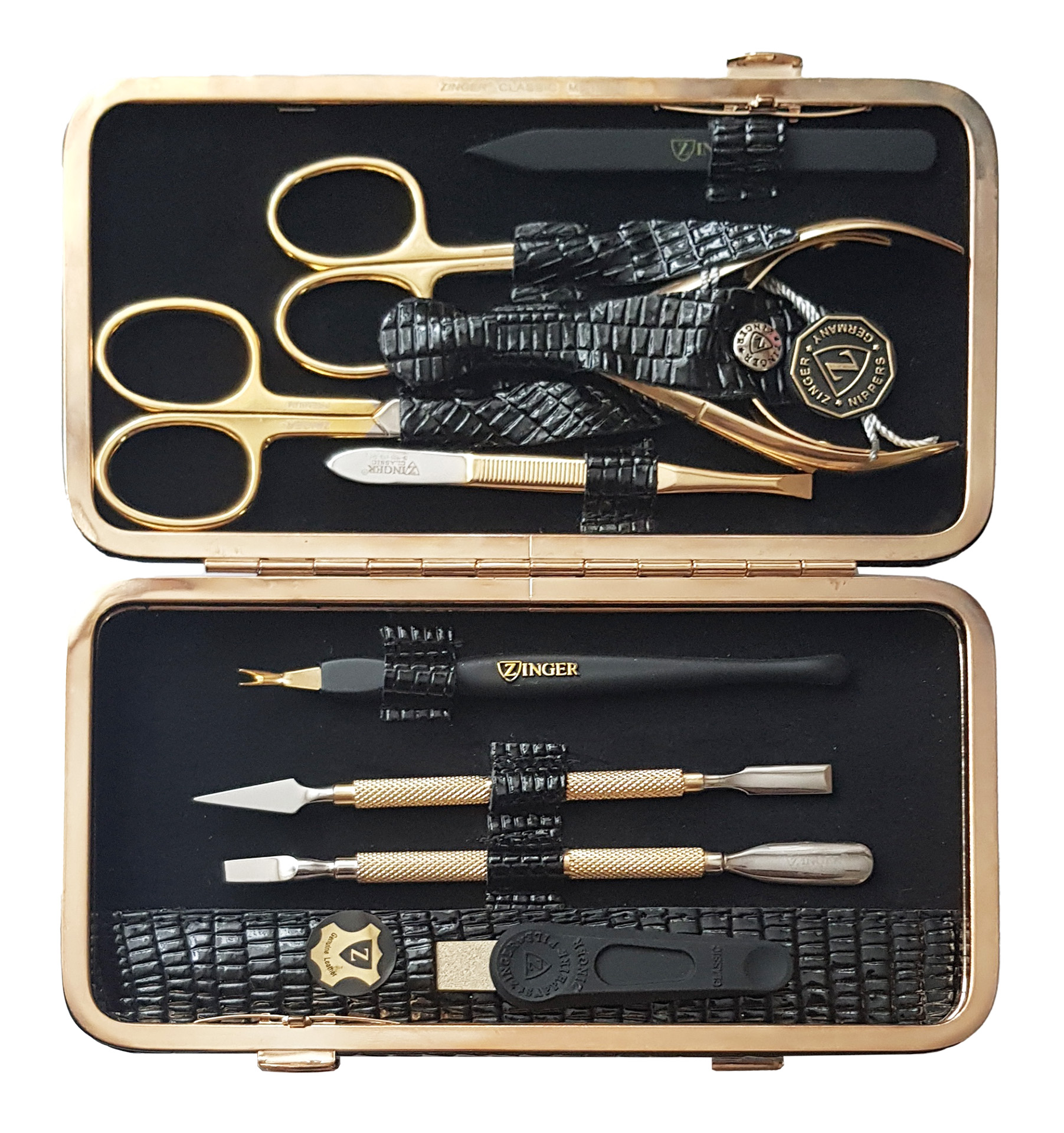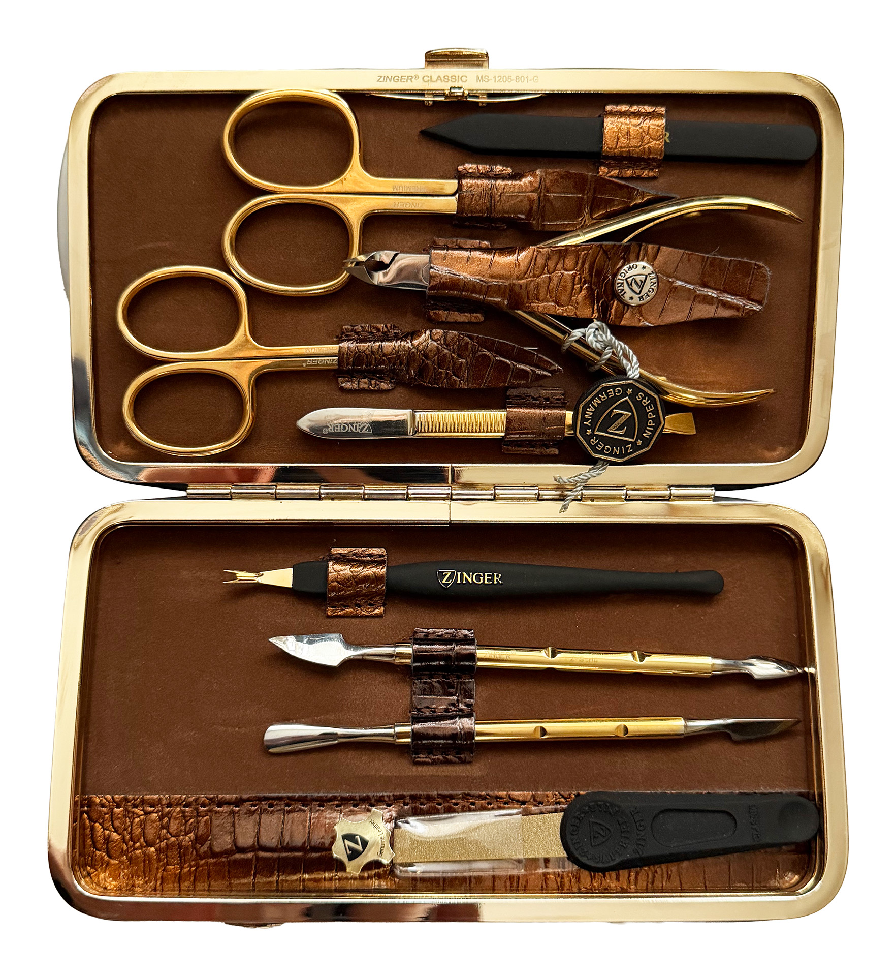 Маникюрный набор Zinger MS-1205-801 G, золотистые инструменты, 9 предметовДорогой и солидный подарок 2 в 1. Максимально полный ассортимент инструментов для маникюра на дому, а также удобная шкатулка для хранения сопутствующих принадлежностей. Состоит из 9 предметов.Производитель: Zinger Цвет * Недоступно Недоступно 11 000,00 ₽ Количество: В корзину Пользовательский список пожеланий OKДобавить в список пожеланийСравнитьСообщить другуФутляр в виде шкатулки. Верхняя часть предназначена для хранения инструментов, а нижняя используется в качестве шкатулки для украшений или флакончиков с лаком и средствами по уходу за ногтями. Высота внутренней шкатулки 3 см. Во внутреннюю крышку встроено большое зеркало. Удобная ручка для переноски. Замки на футляре – автомат. Внутренняя отделка футляра – велюр под замшу, в тон коже. Упаковывается в картонную коробку.Состав набора:ножницы для кутикулыножницы для ногтейкусачкитриммерпинцетпластиковая палочка для отодвигания кутикулыметаллическая пилка2 металлических пушера разной формыХарактеристикиИмя атрибутаЗначение атрибутаКоличество в упаковке9 шт.ПроизводствоИталия