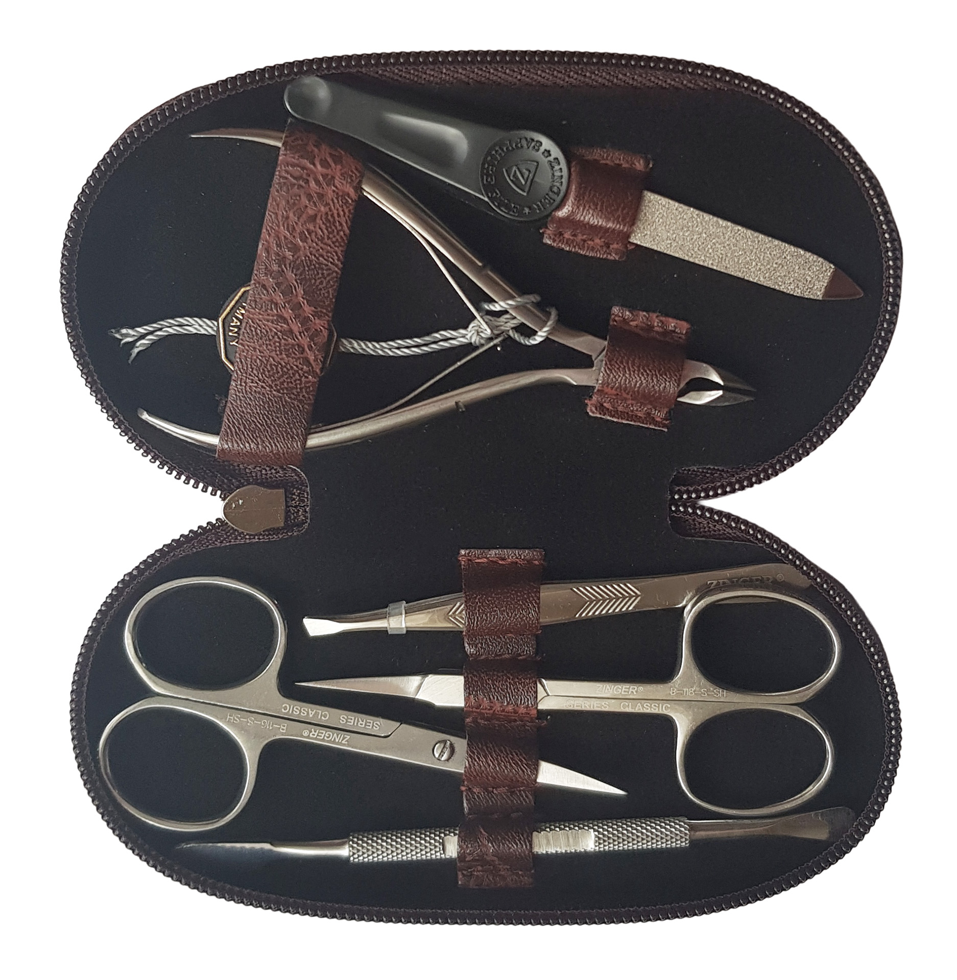 Маникюрный набор Zinger MS-71046.Футляр изготовлен из натуральной кожи. Внутренняя отделка футляра - мягкий велюр, имитация замши, цветом в тон коже футляра. Подарочная коробка с логотипом, внутри отделана бархатной бумагой. В набор входят 6 предметов: кусачки маникюрные, ножницы маникюрные 2 шт., двухсторонний пушер, металлическая пилочка, пинцет. Цвет покрытия металла - серебристый.