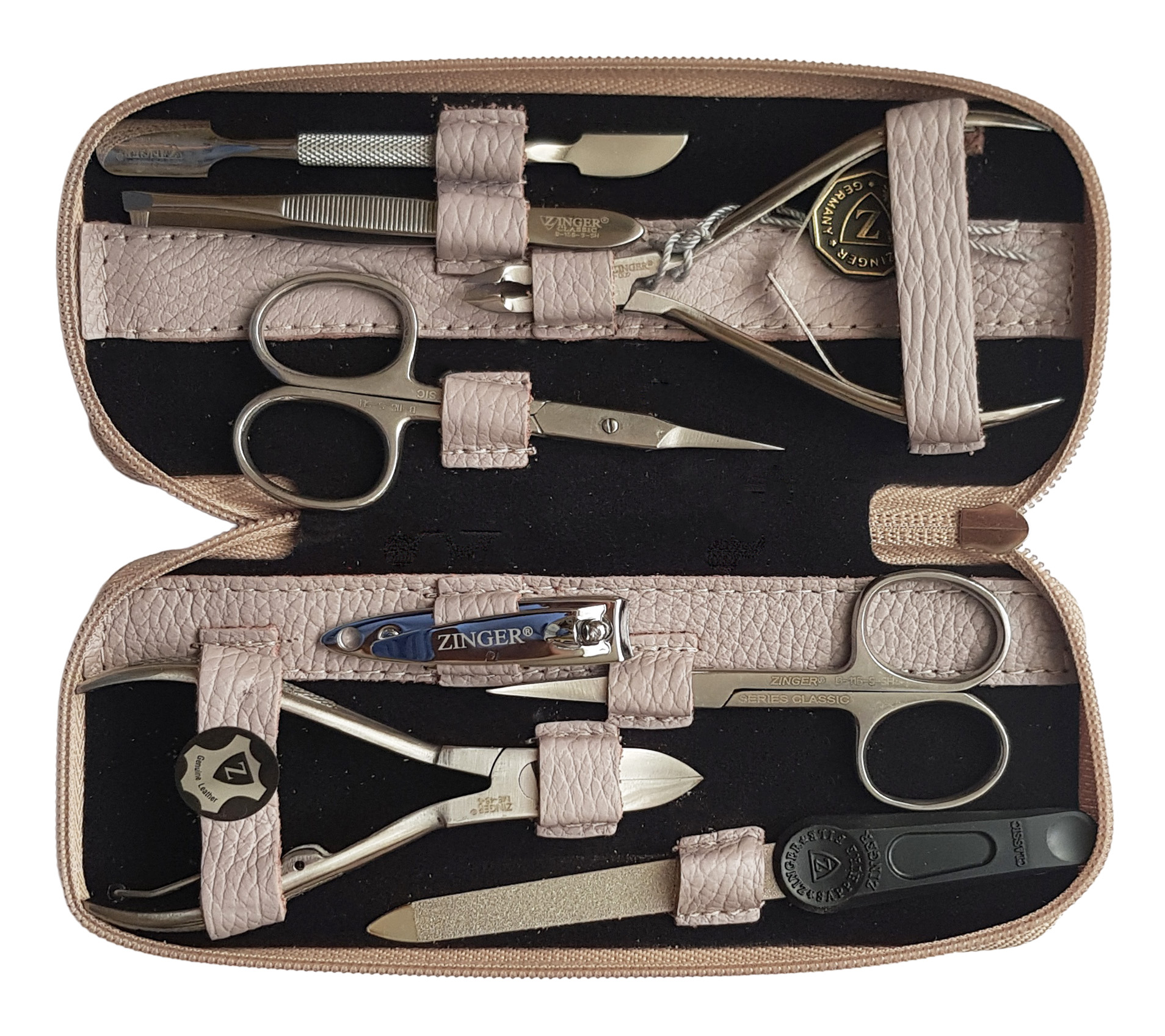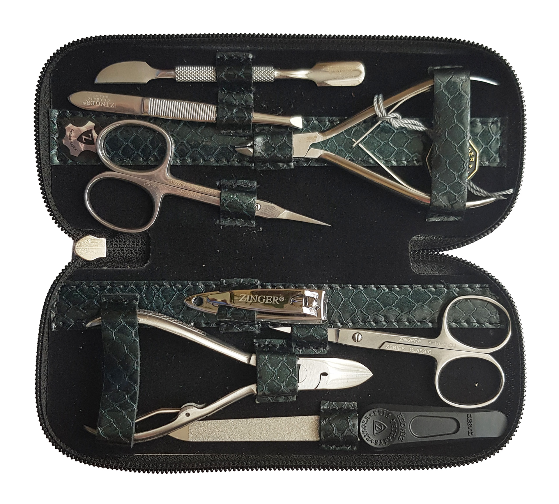 Маникюрный набор Zinger MS-7106 S. Футляр изготовлен из натуральной кожи. Внутренняя отделка футляра - мягкий велюр, имитация замши, цветом в тон коже футляра. Подарочная коробка с логотипом, внутри отделана бархатной бумагой. В набор входят 8 предметов: кусачки маникюрные 2 шт., ножницы маникюрные 2 шт., пинцет, маникюрная палочка, пилочка, книпсер. Цвет покрытия металла - серебристый.